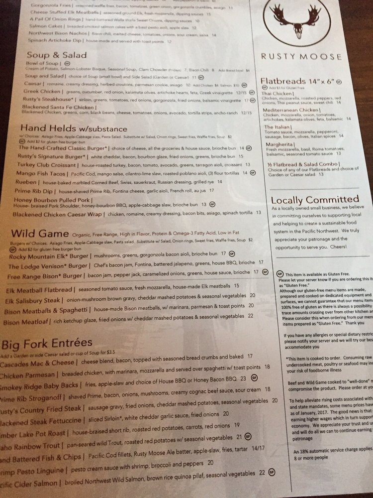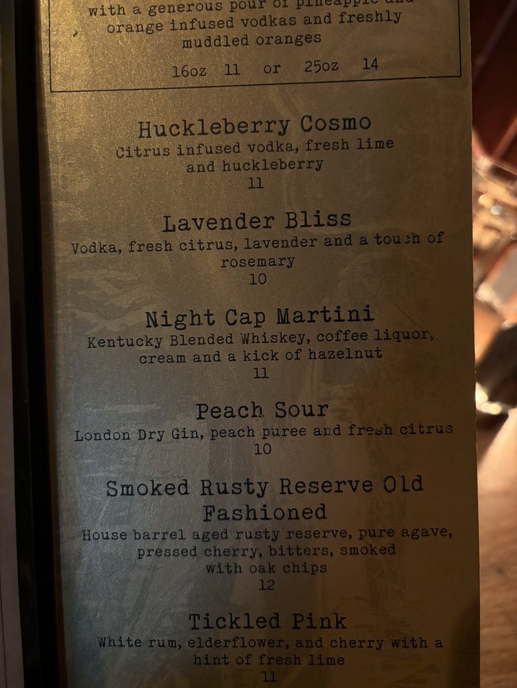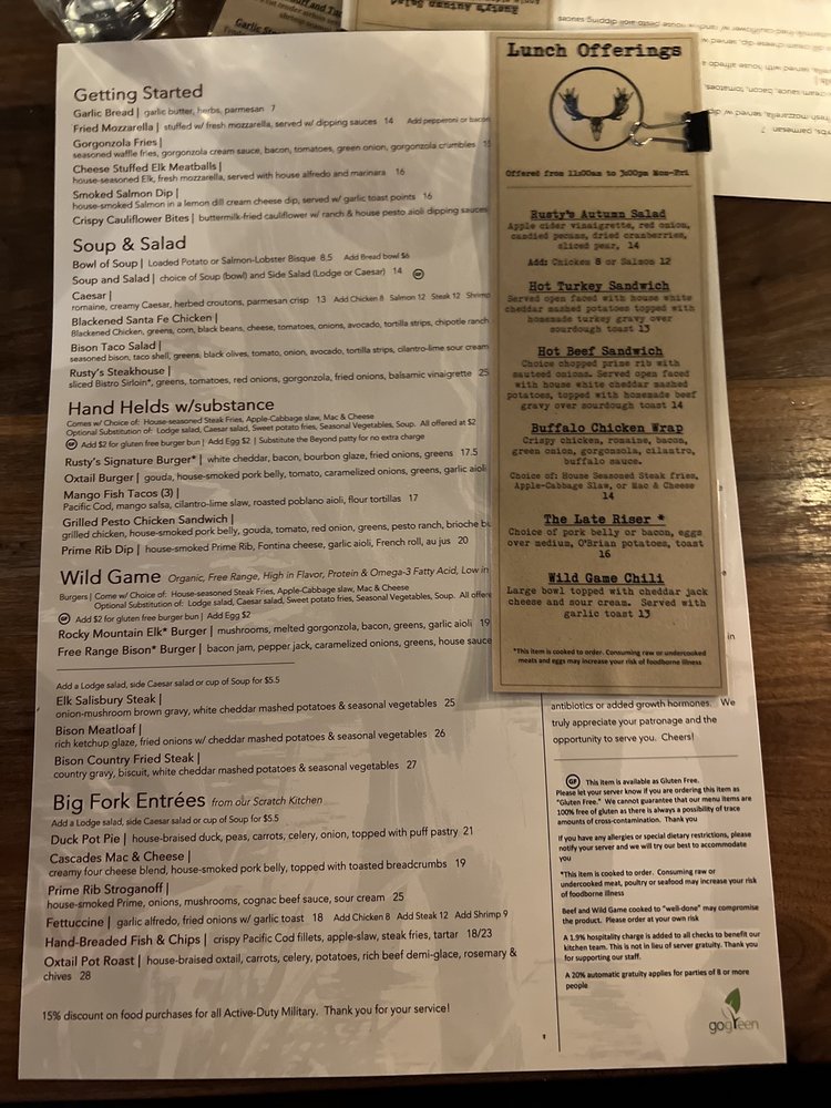 The menu shines with highlights such as the Rusty's Signature Burger and the Rocky Mountain Elk Burger, both packed with flavor. Don't miss the Smokey Ridge Baby Backs, served with flavorful Northwest-style BBQ sauce, or the comforting Fettuccine Alfredo for pasta lovers. Vegetarian options abound, ensuring everyone finds something delightful.
